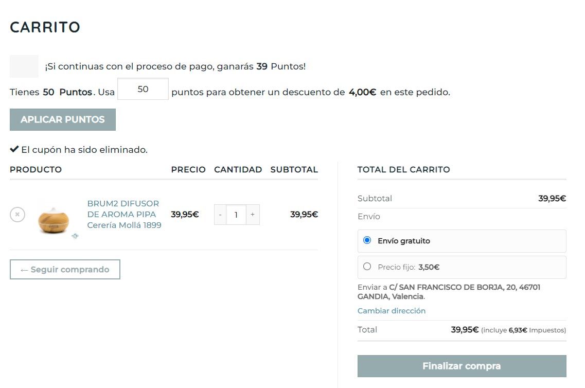 En la imagen vemos cómo se nos informa de los puntos que acumulamos al realizar la compra, y nos da la opción de cajear por un descuento los puntos acumulados. Solo hay que clicar en el botón aplicar puntos y el descuento se aplicará. Es muy sencillo.